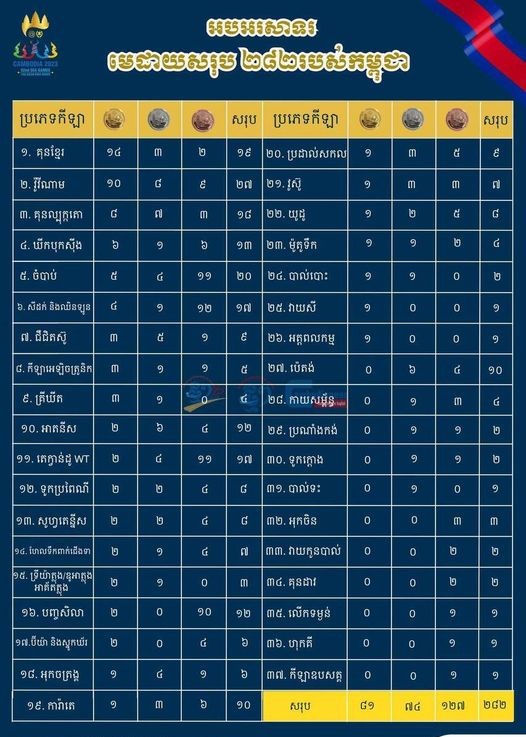 បំផុតកម្ពុជាឈរនៅលំដាប់ថ្នាក់ទី៤ បន្ទាប់ពីវៀតណាម ថៃ និងឥណ្ឌូនេស៊ី នៅក្នុងព្រឹត្តិការណ៍នៃការប្រកួតកីឡាស៊ីហ្គេមលើកទី៣២ ដែលកម្ពុជាធ្វើជាម្ចាស់ផ្ទះ។ កម្ពុជាបានឈ្នះមេដាយសរុបចំនួន២៨២ ក្នុងនោះមេដាយមាស៨១ ប្រាក់៧៤ និងសំរឹទ្ធ១២៦។ តែបើគិតពីចំនួនមេដាយច្រើនកម្ពុជាជាប់ចំណាត់ថ្នាក់លេខ៣នៃប្រជាជាតិអាស៊ាន១១ប្រទេស។ រីឯប្រទេសដែលឈរនៅចំណាត់ថ្នាក់លេខ១កំពូលតារាងគឺវៀតណាម ដោយវៀតណាមបានឈ្នះមេដាយសរុបចំនួន៣៥៥ ក្នុងនោះមាស១៣៦ ប្រាក់១០៥ និងសំរឹទ្ធ១១៤។ ចំណាត់ថ្នាក់លេខ២ គឺថៃ ទទួលបានមេដាយសរុបចំនួន៣១៣ ក្នុងនោះមាស១០៨ ប្រាក់៩៦ និងសំរឹទ្ធ១០៩។ រីឯចំណាត់ថ្នាក់លេខ៣លើកម្ពុជាគឺឥណ្ឌូនេស៊ី ដោយឥណ្ឌូនេស៊ីទទួលបានមេដាយសរុប២៧៦ ក្នុងនោះមាស៨៧ ប្រាក់៨០ និងសំរឹទ្ធ១០៩។