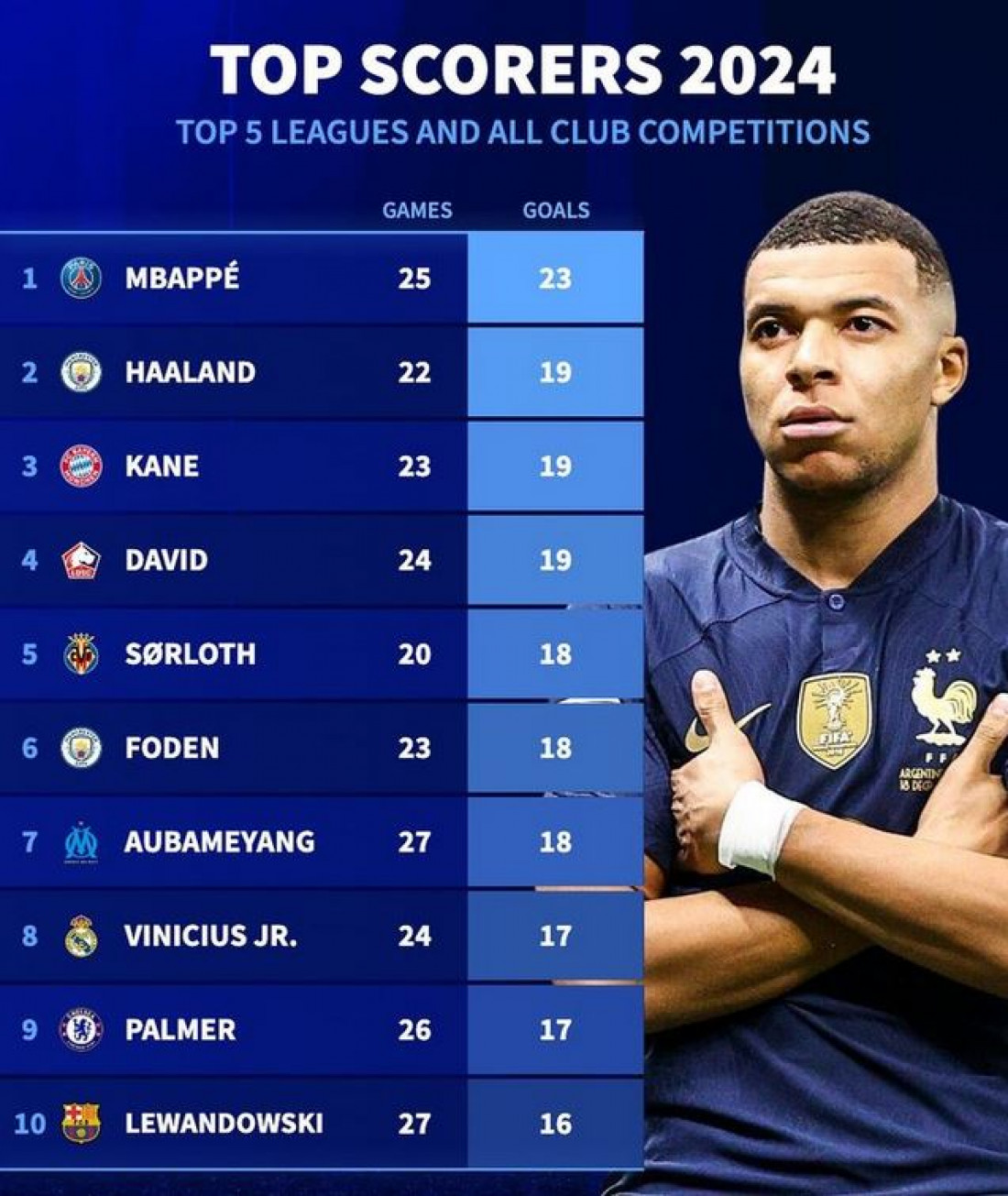 កីឡាករទាំង១០រូបនៅក្នុងលីគកំពូលអឺរ៉ុបទាំង៥ ដែលរកគ្រាប់បាល់បានច្រើនបំផុត ក្នុងឆ្នាំ២០២៤គិតមកត្រឹមពេលនេះក្រោយរដូវកាលឆ្នាំ២០២៣/២៤ ត្រូវបានបញ្ចប់។ បើយោងតាមស្ថិតិរបស់ Transfermarkt កាលពីពេលថ្មីៗនេះ។ក្នុងអត្ថបទនេះ Sabay នឹងធ្វើការរៀបរាប់លម្អិតនូវកីឡាករ៣រូប ដែលរកគ្រាប់បាល់បានច្រើនជាងគេបំផុតក្នុងពេលវេលាខាងលើនេះ។កីឡាករដែលរកគ្រាប់បាល់បានច្រើនជាងគេនោះគឺ ខ្សែប្រយុទ្ធ Kylian Mbappe ដែលមកក្លឹប Paris Saint Germain ដោយចូលលេងបាន ២៥ប្រកួត និងស៊ុតចូល ២៣គ្រាប់។ កីឡាករនេះជាកីឡាករឆ្នើមរបស់ PSG យ៉ាងណាកីឡាករនេះនឹងចាកចេញពី PSG ដោយបន្តក្ដីស្រមៃនៅ Real Madrid នៅរដូវកាលថ្មីខាងមុខនេះ។